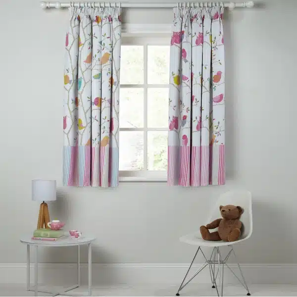 For kids’ room curtains, we recommend using soft fabrics like cotton blends, polyester, and blackout-lined microfiber. These fabrics resist the harshness of the sunlight and are easy to look after.