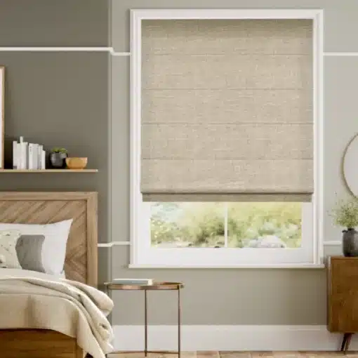 The Pure Linen Roman Blind exudes natural luxury with gentle mushroom and beige hues. Made from 100% linen, it adds a serene and sophisticated touch to any room. Custom-made for a perfect fit, it offers smooth operation with optional upgrades for effortless, stylish functionality.